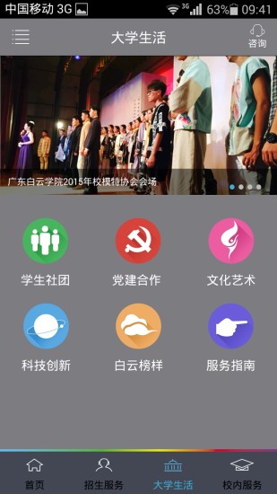 三、大学生活,提供学生社团介绍和动态、党建合作资讯、文化艺术新闻、科技创新动态、白云榜样展示、服务指南等功能;