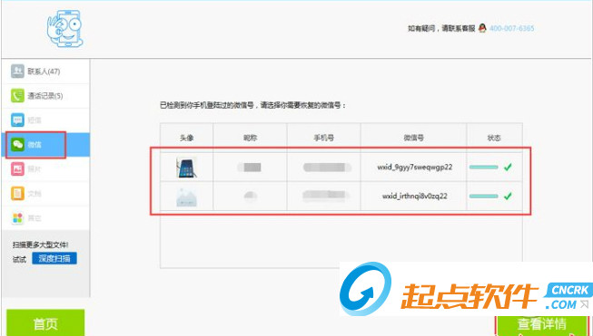 四、待软件成功扫描后,点击左侧的“微信”选项。在右侧选择需要恢复数据的微信号后,点击“查看详情”。