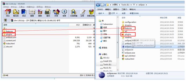 将插件包features和plugins目录中的文件分别复制到Eclipse安装目录的features和plugins中。