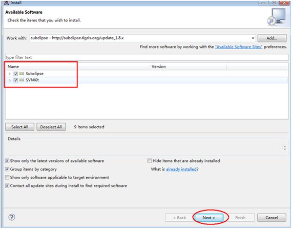 使用Eclipse 里Help菜单的“Install New Software”,通过输入SVN地址,直接下载安装到Eclipse里