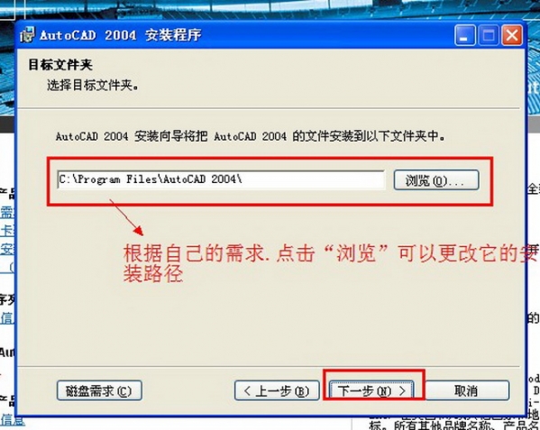 CAD2004 32/64位中文版的安装路径根据自己的要求可以点击“浏览”自己更改 然后点击“下一步” 如图九。