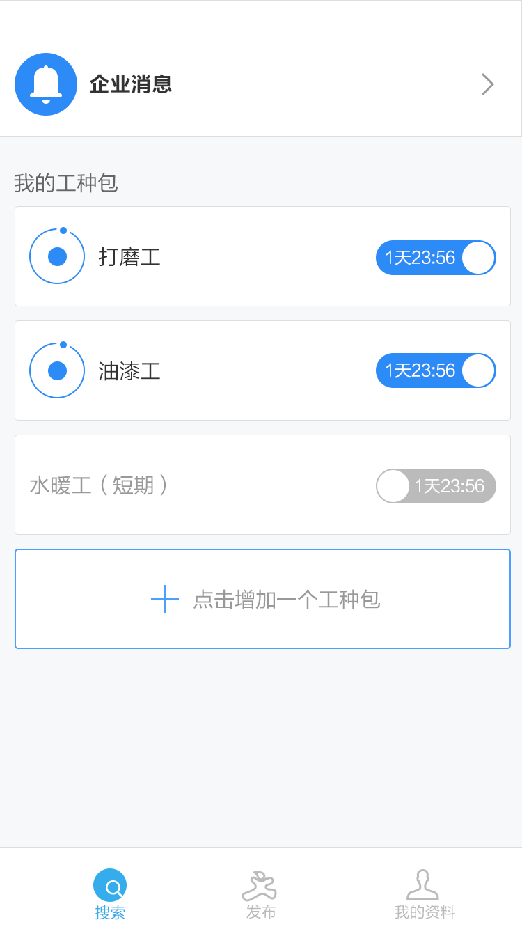 1、工种关键词聚焦,工人可直接点击查看自己喜欢的工作2、直接电话沟通,省去订单交互流程,提高招聘对接效率。