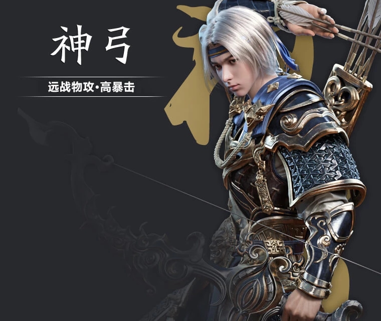 远战物理系,远距离攻击,其连射及蓄力攻击伴随的高暴击伤害输出能在国战中给敌人们最沉重的打击,其急退技能在千军万马中从容撤退以黄忠为原型的武器职业设计能让玩家在最大程度上享受国战破敌千万的快感。
