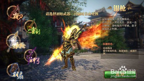 进游戏后第二个任务就是选择职业,职业有5种职业,分别是霸刀,重剑,银枪,神弓,羽扇。职业的选择主要是个人喜欢,如果是刚玩的,建议选霸刀,比较好上手。