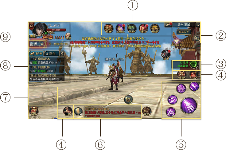 4、快捷按钮区,玩家可快捷上马、挂机等功能。