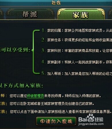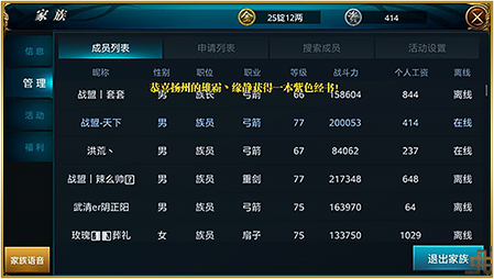 家族系统家族由玩家自行申请建立,或者加入已存在的家族。