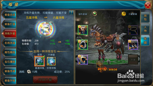 5推6 这里强调 5推6要开始点装备,准备20颗淬炼宝石,用备用装备垫底一颗一颗砸,5颗一轮 每轮成功两次,则马上换取目标5星装备用4颗淬炼宝石砸,80%成功 5秒内联系砸两件6星成功率70%左右。