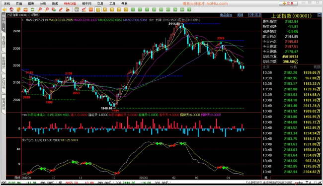 2.调出分时图页面,敲击键盘上的向下箭头,可以向前请求一天的历史回忆,最多请求10个交易日(含当日),敲击键盘上的向上箭头,可以撤销一天的历史回忆,直至恢复只显示当日的分时走势图。