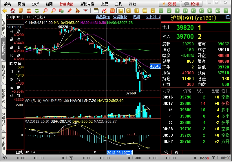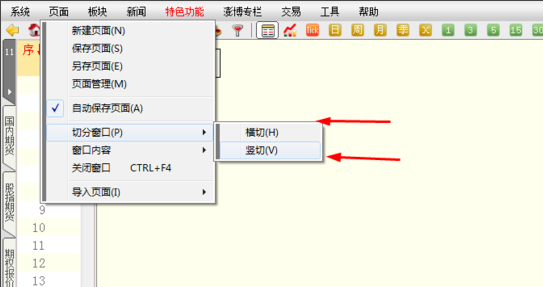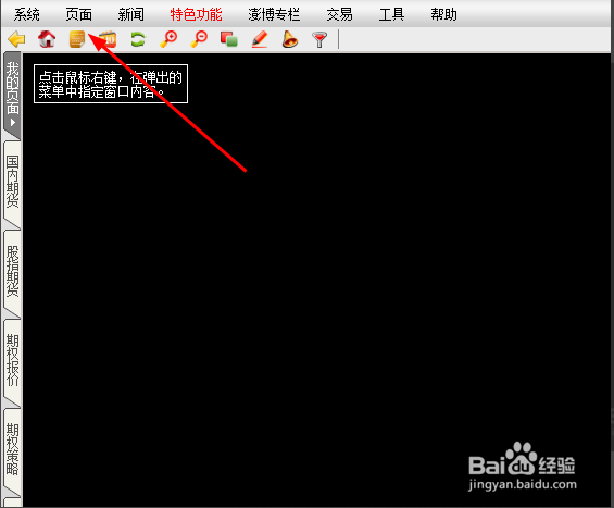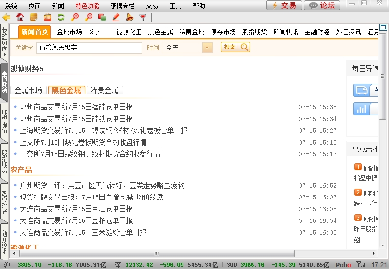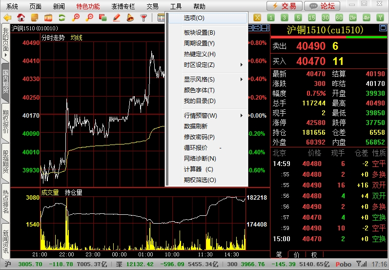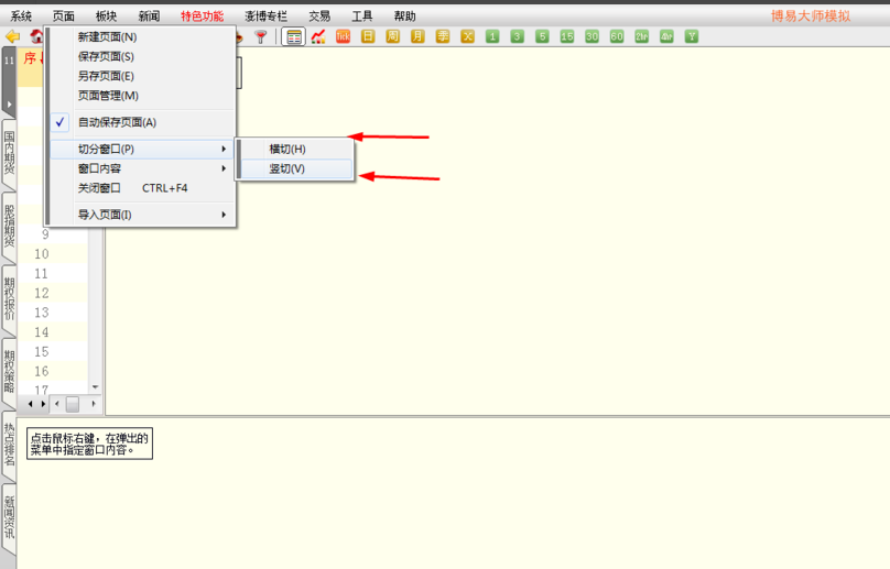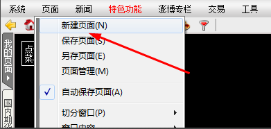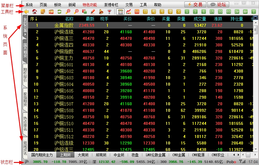 1.菜单栏由左向右依次为:系统、页面、板块、新闻、特色功能、澎博专栏(客户定制版面为XX期货专栏)、交易、工具及帮助。右端还有“交易”和“心连心”两个按钮,点击“交易”后可打开闪电手登陆界面,点击“论坛”可使用默认浏览器打开“澎博财经产品问答平台”。