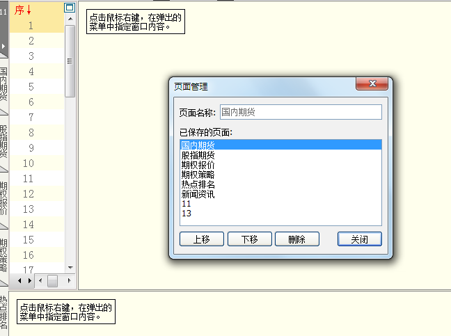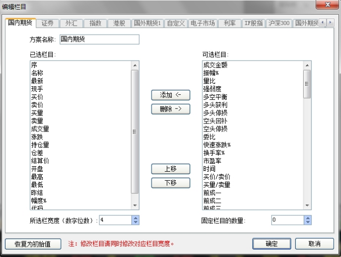 (2) 在 “编辑栏目”对话框中选择相应的页面标签,如“国内期货”、“证券”等某标签,选择需修改的栏目,点击“添加/删除”使该栏目显示或不显示在报价页面上,点击“上移/下移”调整顺序,在“所选栏宽度”选项中修改数字可调整列宽,修改完成后点击“确定”(如图3-1-3)。