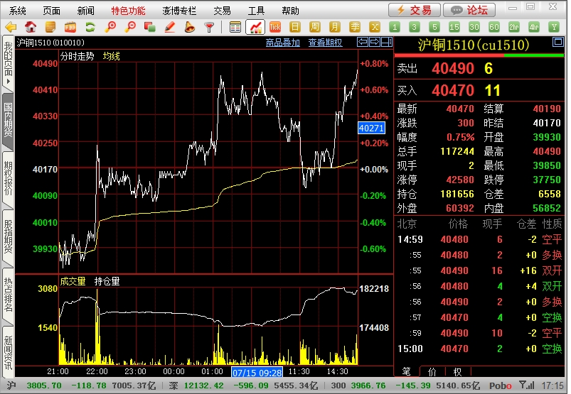 2.期货品种分时走势图中黄线为均价线,即当日开盘至这一分钟加权平均价的连线。