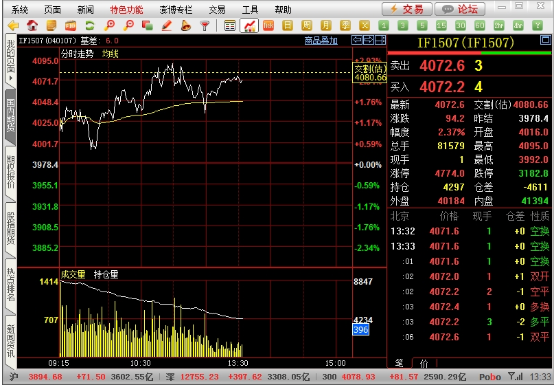 3.对于IF品种,在当月合约交割当天(合约到期月份的第三个周五,遇国家法定假日顺延)13:00-15:00期间,分时走势图上会出现一根黄色虚线,也就是交割估价线,这根线是根据沪深300算术平均得出的,且实时变动(如图3-3-1)。