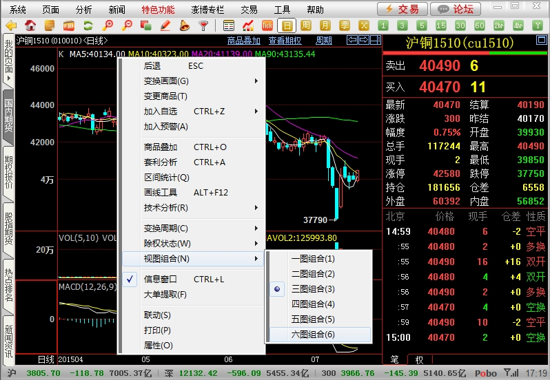 K线图界面由主图和副图组成,可实现多个副图显示,系统默认为三图组合(成交量和一个指标,默认为MACD),如需要调整副图数量,只需在K线图空白处单击鼠标右键选择“视图组合”进行调整即可(如图3-4-1)。