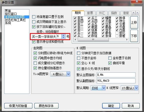 操作方法:点击菜单栏上的“工具”,在下拉菜单中选择“选项”(如图6-1-2),在弹出的对话框选择“走势图和K线图”(图6-1-3),在“选中行买一卖一字体放大N号”中进行调整,调整后“买价”“卖价”数字会相应变化(如图6-1-4)。