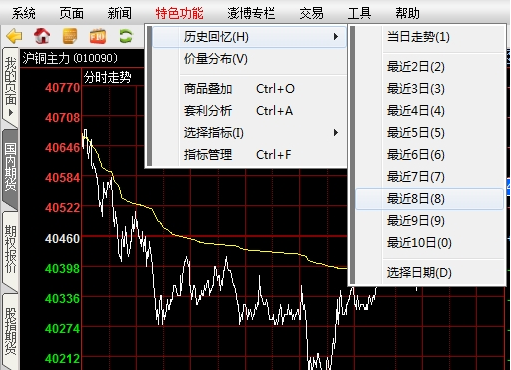1.点击菜单栏上的 “特色功能”,选择“历史回忆 ”,在下拉菜单中可以选择最近X日(如图6-2-1),进入历史回忆图之后,当天的分时走势以黑底显示,历史走势以灰底显示(如图6-2-2);也可以点击“选择日期”,选择某一个历史交易日(如图6-2-3)。