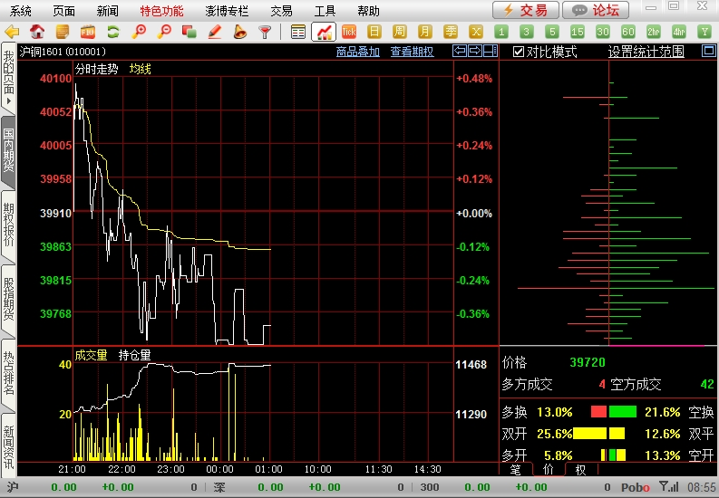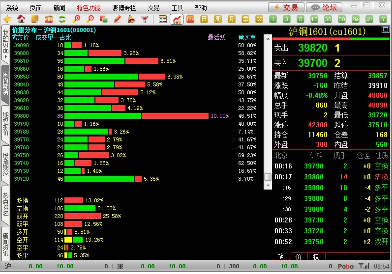 价量分布图可查看某合约的成交量、成交价格等实时的统计信息。查看价量分布有以下几种方式: