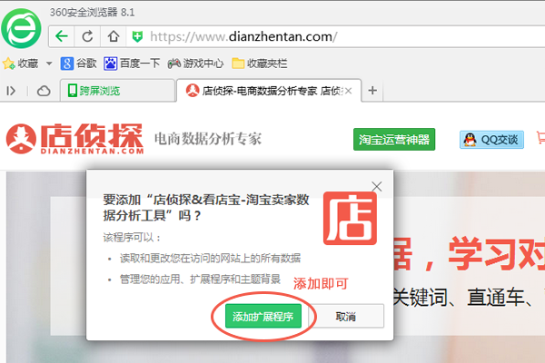 看店宝软件怎么安装?1、下载店侦探看店宝插件后,将文件拖入到要安装的浏览器中。(下面以360安全浏览器为例)