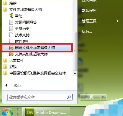 1、点击开始按钮、点击程序,点击文件夹加密超级大师、点击删除文件夹加密超级大师。