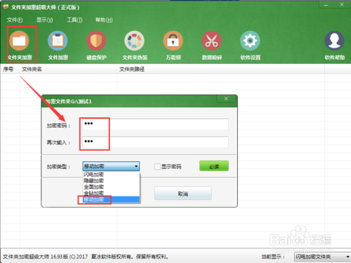 输入设置的密码,加密类型选择【移动加密】。然后点击确定。加密完成