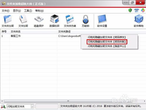 双击进入软件主界面,然后找到加密的数据,在加密的数据上单击鼠标右键,选择“密码恢复”选项,如图所示