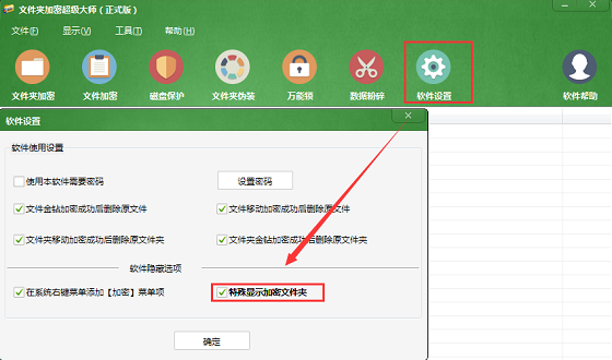 在软件设置里面,取消勾选【特殊显示加密文件夹】,这样闪电加密文件夹或者金钻加密文件夹还是显示的是普通文件夹的样子,不是绿色的文件夹了,但是打开需要密码。