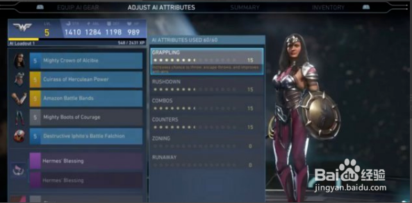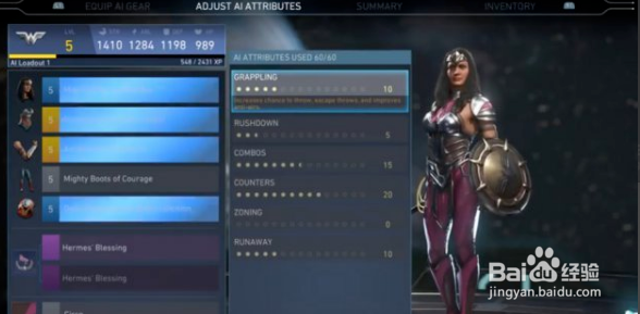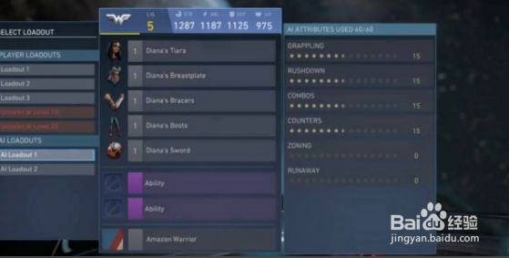 在characters里选一个想要升级的角色,比如说神奇女侠,然后在loadout里选择AI Loadout1 再按手柄的R1键 挑出AI attributes的数据。