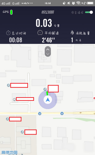 3.绿色图标显示的是你所在位置(我在公园跑步时,GPS信号有点差);