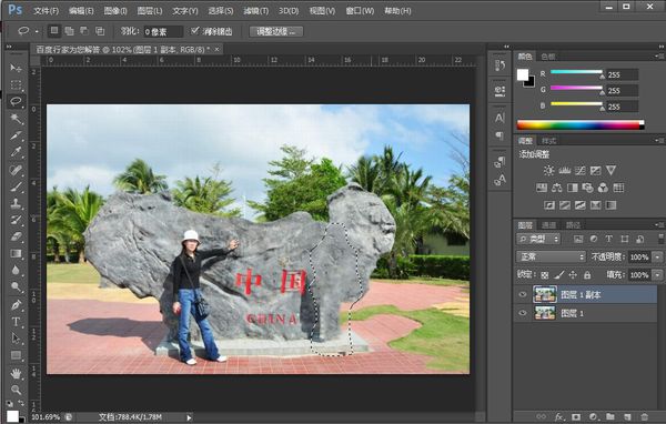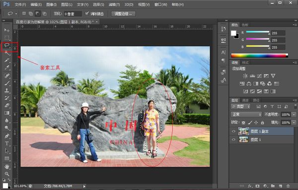 3、选择”套索工具“,将人物的大概轮廓套选出来,如图。按”Shift+F5“进行内容识别填充。