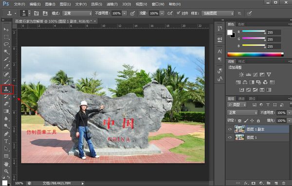 5、最后,选择”仿制图章工具“,按住Alt键吸取原始的部分作为源,然后对填充的部分进行涂抹。