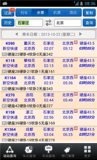 盛名时刻表下载很简单,百度或者使用手机助手就可以下载安装了,打开软件后我们首先可以看到站站查询,在上面输入始发站和终点站然后点击查询可以就看到有哪些火车了。