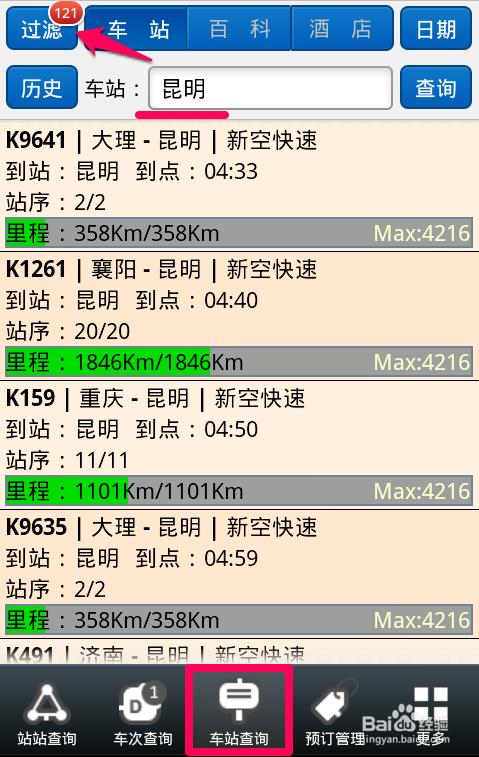 不仅如此,我们还可以点击盛名时刻标的车站查询,我们可以看到某一车站所有的列车,车太多不好找没关系,我们可以点击过滤。
