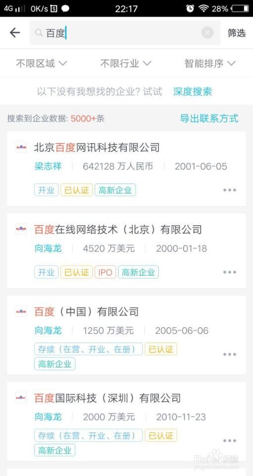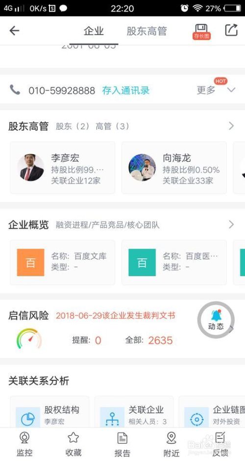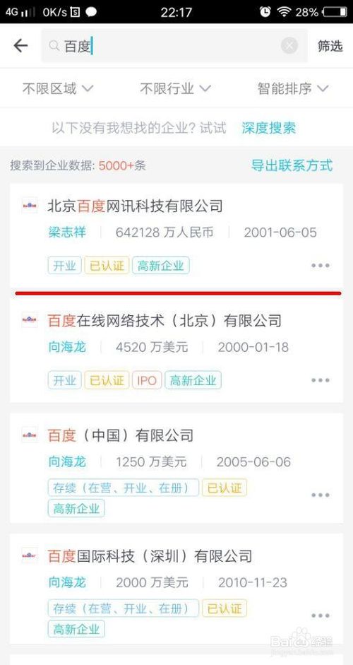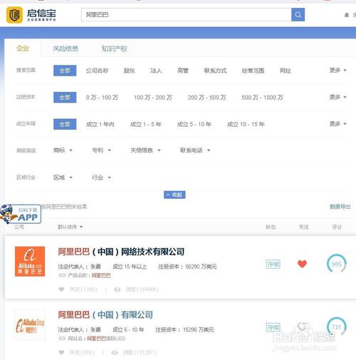 例如我们向知道百度公司的基本信息,我们可以在首页界面上的搜索框内输入“百度”,启信宝就会自动帮我们检索出有关百度的一些企业信息,