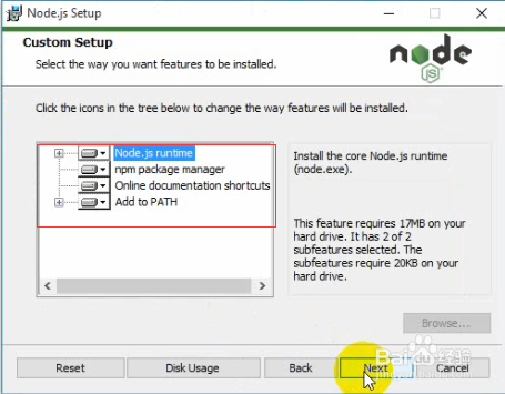 3.安装Node.js,双击安装包,然后点下一步下一步即可。注意环境的配置(图1),最后安装成功后的界面如下(图2)