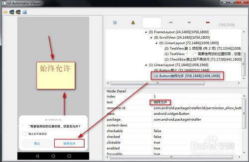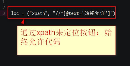 2.弹窗是可以直接定位到的,这里不能通过id去定位了,因为弹窗比较多,每次id都不太一样,但是文本text都是一样的:始终允许
