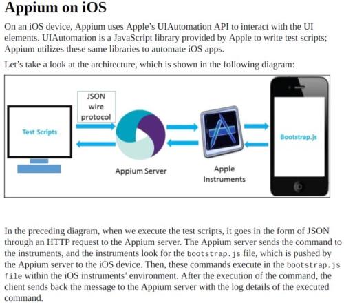 Appium 可以驱动多种原生自动化框架,同时也提供基于 Selenium 的 WebDriver JSON wire protocol api。基于Dan Cuellar's 在 iOS 自动化上的成果,Appium 通过驱动 Apple 的 UIAutomation 库来提供 iOS 支持。