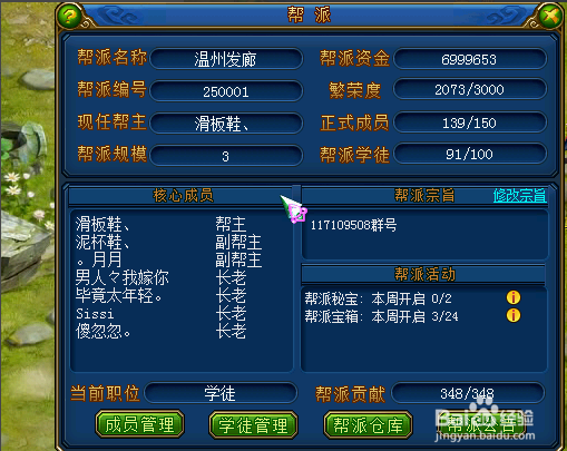 当完成了帮派建立的相关过程之后,就进入到了帮派管理阶段。如下图,帮派管理可分为四点:成员管理、学徒管理、帮派仓库、帮派公告。