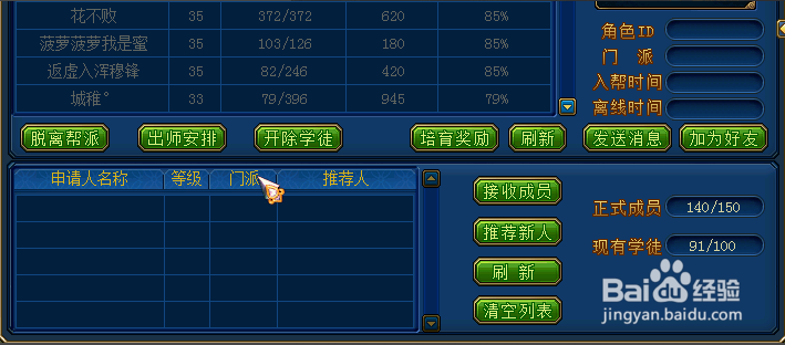帮派学徒管理也可依据目标对象的身份分为两类管理操作。第一类是对帮内学徒,可以进行出师安排、开除、发放培育奖励操作。第二类接收申请入帮的玩家成为帮派学徒以及推荐新人。