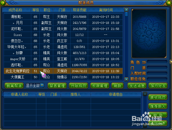 帮派成员管理可以分为两个部分:第一部分是对帮内成员进行禁言、开除、设置权限的操作,其中禁言和开除比较容易理解,权限管理是只有帮主才有的权利,它的另一层含义就是分封,即设定某些帮派成员作为副帮主、长老等帮派高管。第二部分是对帮外成员,主要是接收申请人为新成员、推荐新玩家成为帮众。