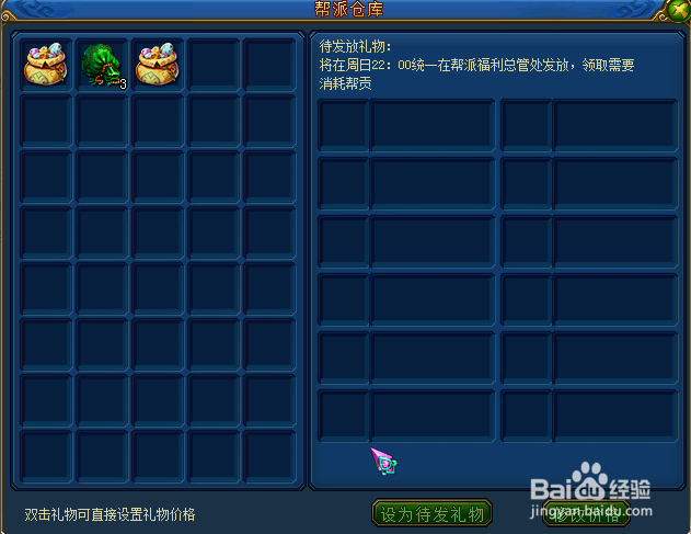 帮派仓库是存放帮派奖励的地方,这些物品可能是帮战胜利的奖品、也可能是帮派帮派高层放入其中。帮主可以设置这些奖励兑换的价格,帮众可以在特定时间消耗相应的帮派贡献值换取其中的奖励。这是激励帮派成员进行经商、资材等帮派发展任务的主要手段。