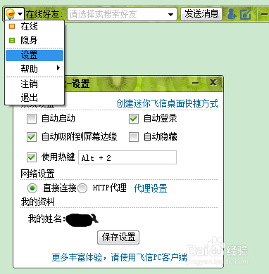 在”在线好友”左边有个倒三角,点击即可看到更换在线状态和设置等一些功能界面.打开设置,可以设置一些功能,用户可根据自己需求更改设置,改好后点击保存