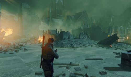 出了安全门之后左转,远处楼上会有狙击手,如果直接向前走大路会有自爆僵尸冲过来.这里可以不用理会狙击手,只杀掉自爆兵然后一路冲到教堂里.