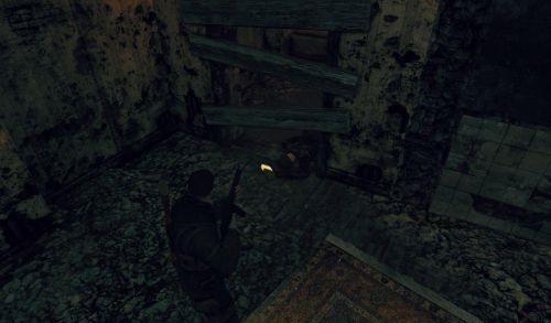 往右边走慢慢把怪清掉到达大门检查点,这个时候上楼往右边走到尽头能发现金块。(环境有点黑,要看其反光)