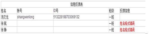 6.出现以上错误的解决方法:检查反馈信息所对应的姓名,姓名必须是中文汉字,不能带有字母、数字、符号、空格键等,修改后保存文档重新导入。