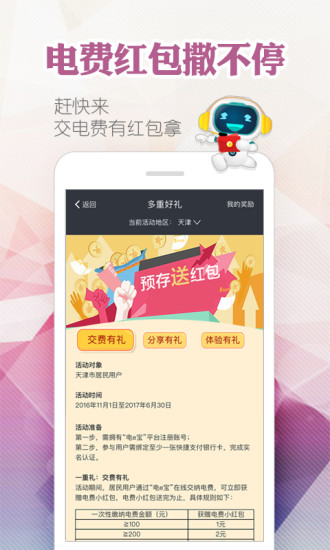 电e宝是一款缴纳电费的民生服务云平台。该平台向用户提供一站式智能电费缴纳和多场景金融理财服务,方便用户随时随地缴费和理财投资,为用户打造便捷、高效的生活方式。