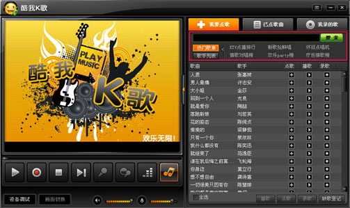 1、点击“录歌”按钮,歌曲会添加到“已点歌曲”列表最后,并开始播放和录制;