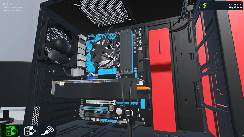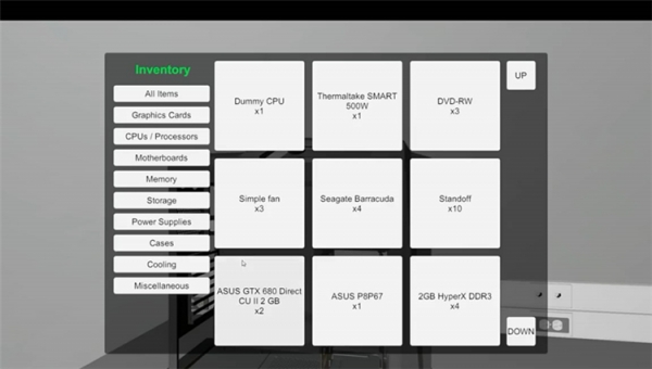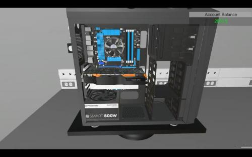 游戏中你身处一个仓库房间,里面堆满了你需要的一切:主板、电源、cpu、显卡....你可以自由支配2000美元的预算来完成一台电脑(为什么这游戏这么抠....现实也就算了游戏里好歹让人组个四路泰坦玩玩吧)。不过目前这款游戏还是处于alpha的状态,也不确定是否能推出最终版本,游戏中的硬件很少而且有些价格实在让人想吐槽,虽说问题非常多,甚至连一款游戏都称不上,但是作为一款安装电脑的模拟器,总比自己把电脑拆了然后试着安来得容易。其实现如今的电脑接口比起几年前已经简单了不少,只要记住一些基本的部件的安装位置,走线就是顺着来的事了。