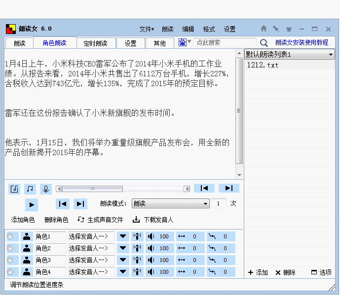 1.确定你文章中的那些段落或句子由那个发音人来朗读。