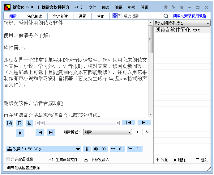 3、安装好语音库后,打开朗读女软件,选择该语音库就可以用它来朗读文本了。