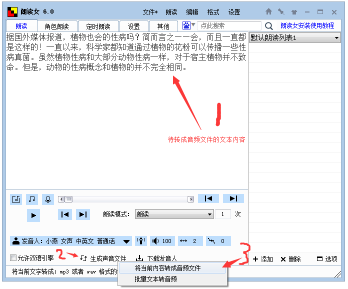 在朗读女软件:中输入或打开你要转成声音的文本内容。
