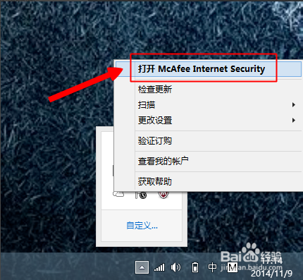 安装完成后,直接在桌面任务栏,点击“显示隐藏的图标”,找到迈克菲,点击右键,选择“打开McAfee internet security”(或者直接在“开始”屏幕应用中找到McAfee internet security,点击打开)